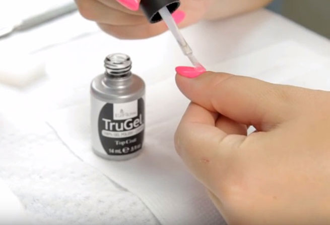В конце этапа подготовки ногтя к покрытию гель-лаком по всей поверхности ногтя нужно пройтись полировочной пилкой. Обработать ноготь обезжиривающим средством. При этом проследить, чтобы на руках не было следов пыли, оставшейся после спиливания и шлифования. Нанести праймер. Некоторые специалисты не пользуются этим средством перед нанесением гель-лака, чтобы не нанести вред ногтевой пластине, ведь праймер пересушивает её. В этом случае маникюр держится тоже достаточно долго. Однако средство всё-таки является дополнительной гарантией хорошего сцепления ногтя с покрытием. Если выбрать бескислотный вариант праймера, который менее агрессивен по сравнению с кислотосодержащим, то он не испортит ногти. Нанести базовое покрытие. Это обязательный этап. Без такого покрытия сцепление гель-лака с ногтевой пластиной будет слабым. Есть, правда, и специальные гель-лаки, предназначенные для нанесения прямо на ноготь. Покрытие необходимо высушить в ультрафиолетовой лампе. Покрыть ногтевую пластину гель-лаком. Это делается в несколько слоёв. Как правило, требуется 2–3 слоя, каждый из которых требует сушки в ультрафиолетовой лампе. Слои должны быть тонкими и не выходить за пределы ногтя. Внешний срез ногтевой пластины также запечатывается гель-лаком. Нанести верхнее закрепляющее покрытие (топ).Отправить в лампу на полимеризацию. Обработать ноготь жидкостью для снятия дисперсионного (липкого) слоя. Для этой цели подойдёт и жидкость для снятия лака без ацетона и спирт. Существуют топы и без липкого слоя.