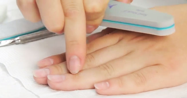 Обработка бафом проводится вдоль ногтевой пластины. Когда все ногти подготовлены, следует смазать кожу вокруг детским или солнцезащитным кремом чтобы ультрафиолет не пересушил ее во время сушки в УФ-лампе.