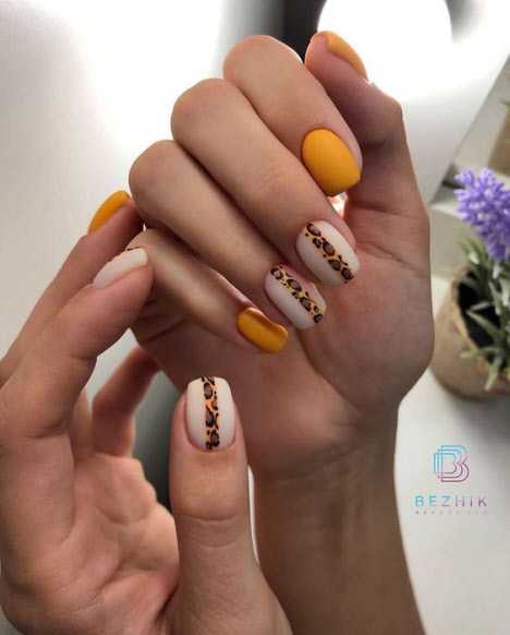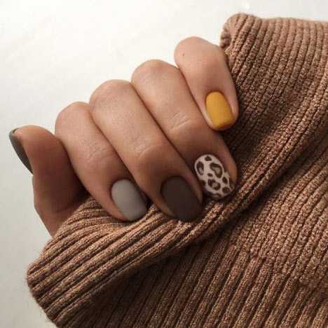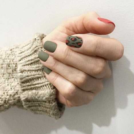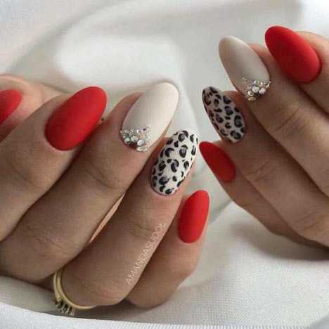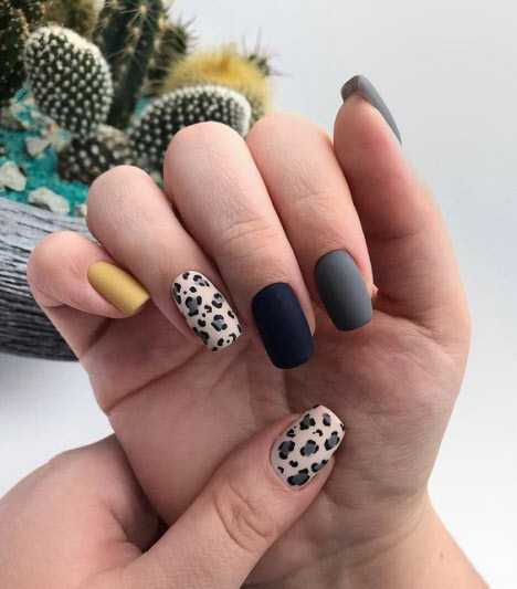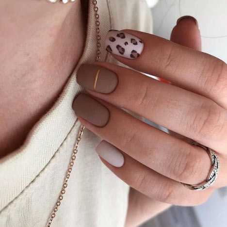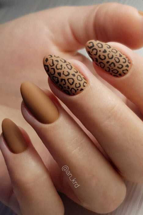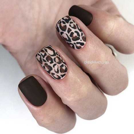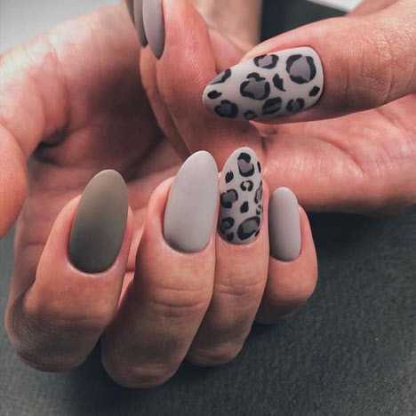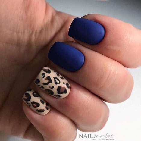 Животный принт в маникюре не теряет своей актуальности, а наоборот, этот модный принт сегодня встречается повсюду: в одежде, аксессуарах, обуви и даже очках. Животный принт можно сочетать с любым стилем, даже корпоративным, выбрать только подходящие оттенки и сделать матовый маникюр, чтобы подчеркнуть красоту принта. Смело можно использовать всю палитру нюд и несколько темных оттенков — красный, синий, черный, коричневый, фиолетовый.