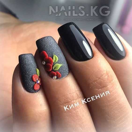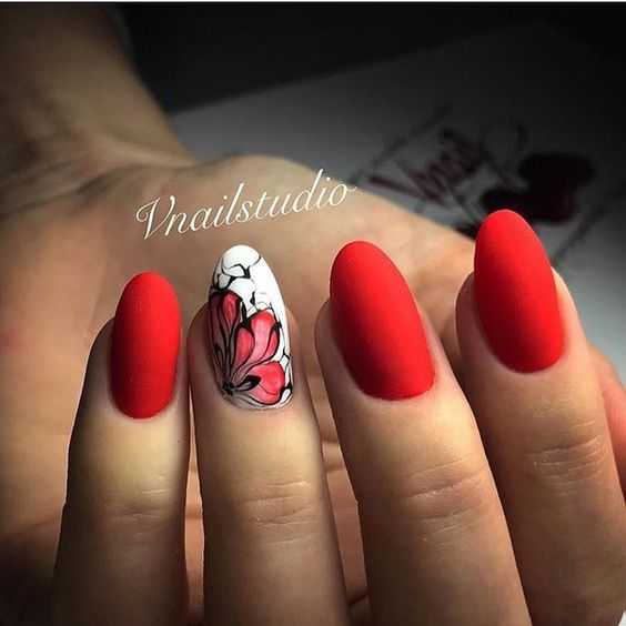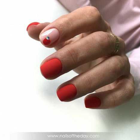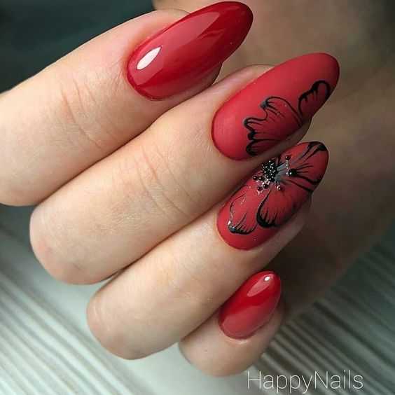 Матовый черно-красный маникюр. Такое оформление подойдет и на короткие и на длинные ногти.