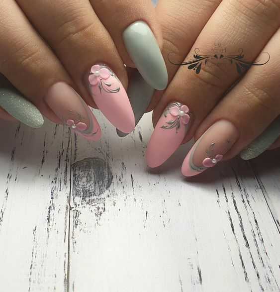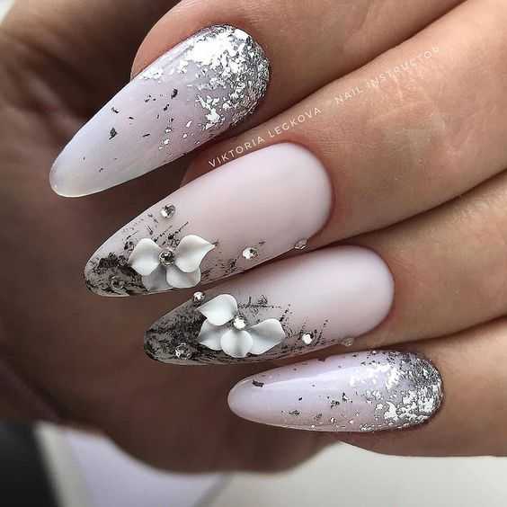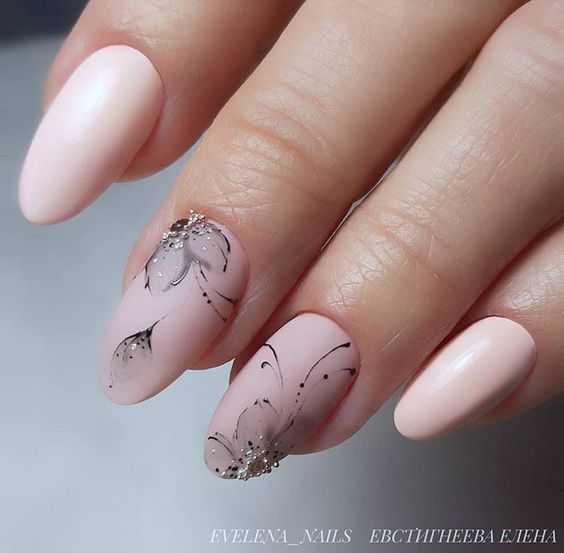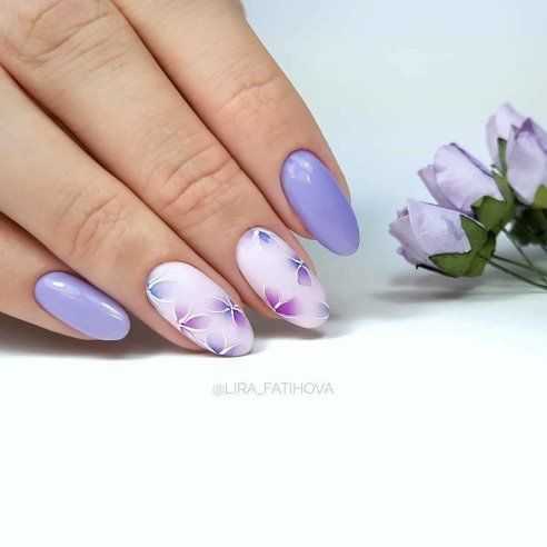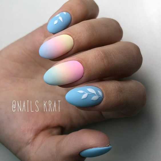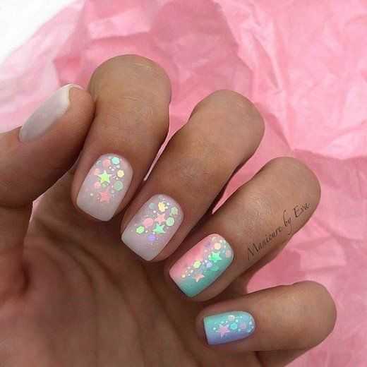 В качестве фона для маникюра красиво смотрится градиент в пастельных тонах или эффект затирания, особенно если такой маникюр оформлен блесками.