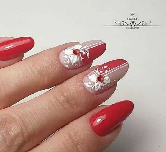 - Накрасьте одну половину ногтя белым цветом (или любым другим по вашему желанию), а вторую половину красным