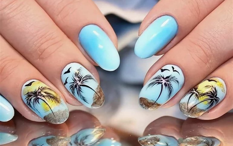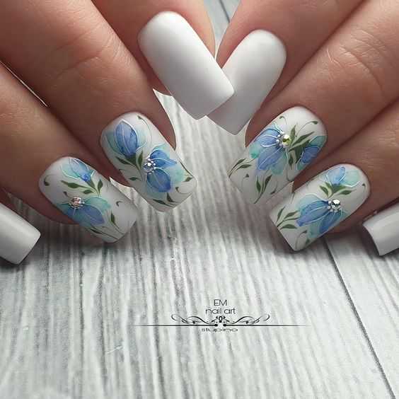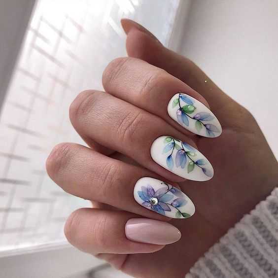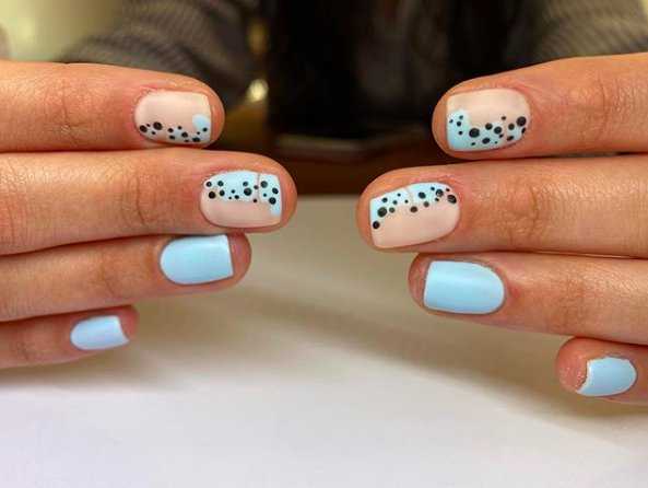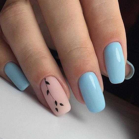 Можно выделить следующие тенденции, которые особенно популярны в 2022 году. Во-первых, это дуохромная окраска, представляющая собой монохромный маникюр на правой руке, выполненный в одном цвете, и такой же на левой, выполненный в другом оттенке. Цветовая гамма может быть любой, но достаточно интересно смотрится вариант с использованием синей и борной красок, разбавленных белым цветом.