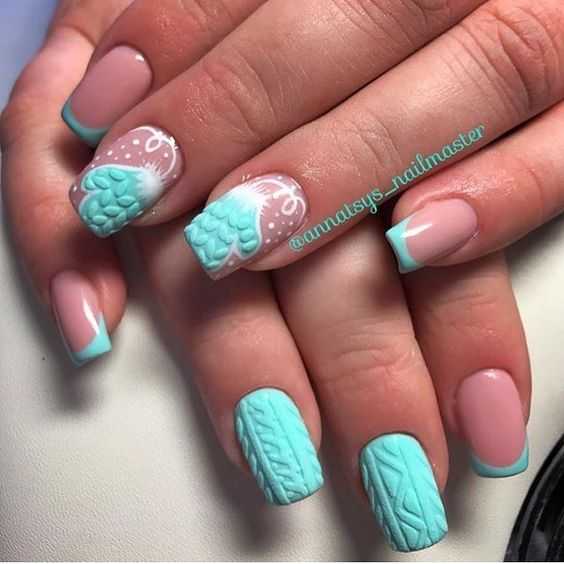 Светло-бирюзовый маникюр в геометрическом стиле на длинные ногти.