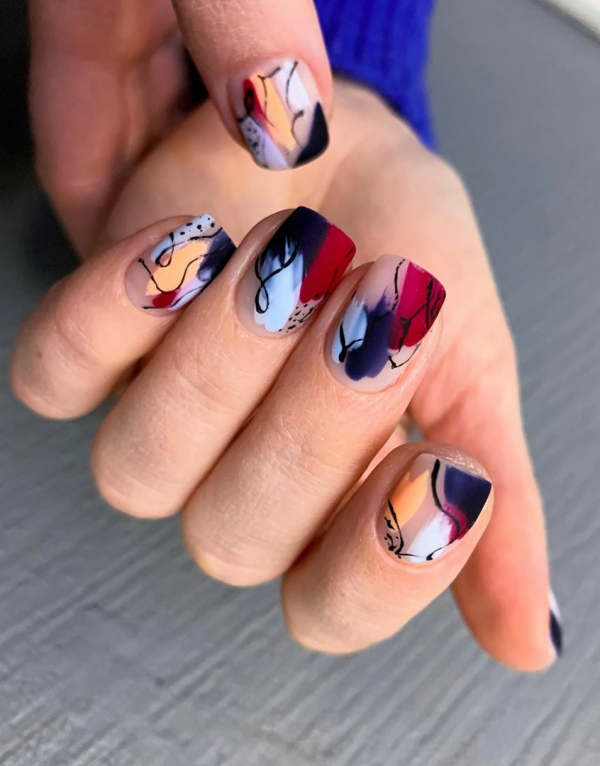 Осенний маникюр 2020 года можно дополнить пенным дизайном ногтей в топовых цветах сезона: бордовый, синий, черный, фиолетовый.