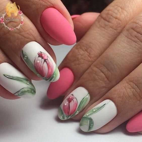 - Ногти с розами. На белой невысушенной подложке нежным пастельным лаком рисуем закругленные линии, имитирующие лепестки. Ждем несколько секунд, пока краски чуть растекутся, и сушим рисунок.