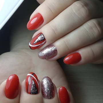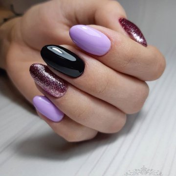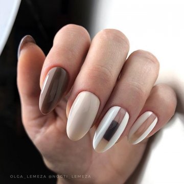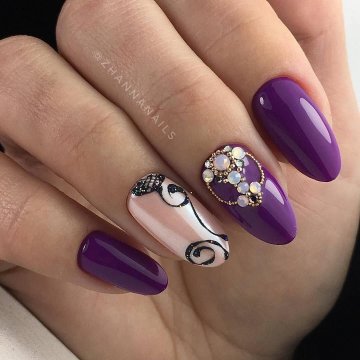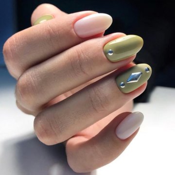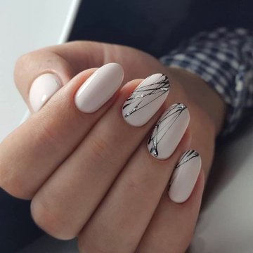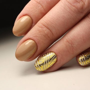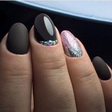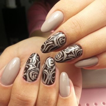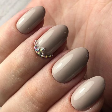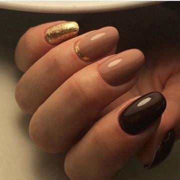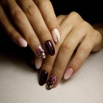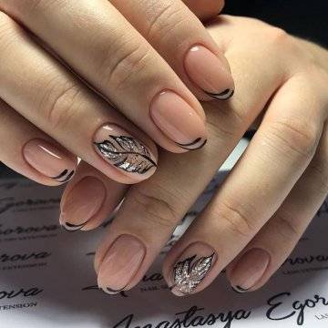 • цветочные двуцветные композиции (актуален угольно-черный рисунок ветвей диковинных растений на светлом бежевом фоне);• восточная выкладка (дизайн со стразами и щедрым покрытием из жемчуга и бисера прикорневой части двух ноготков на каждой руке с применением сдержанного оттенка базы смотрится очень дорого и даже в какой-то мере вызывающе, но при этом невероятно привлекательно);• абстракции со слюдой (маникюр с блестками и фольгой актуален именно на овальной формы ногтях, поскольку обтекаемость их фактуры хорошо сочетается с обтекаемостью самого наложения слюды).