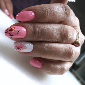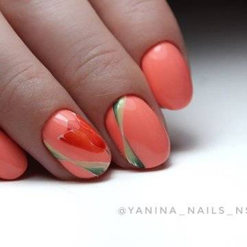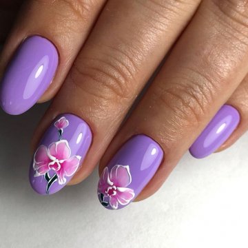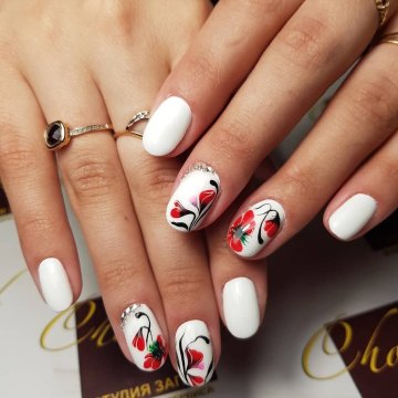 Овал можно назвать идеальным фоном для выполнения любого рисунка. Это может быть как примитивный принт, так и настоящий художественный шедевр. Цветы, нарисованные на таких ноготках, смотрятся невероятно нежно и натурально. Для тех, кто сомневается в своих художественных способностях, специально созданы тематические наклейки, трафареты и стемпы.