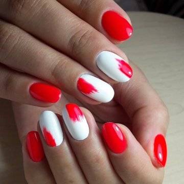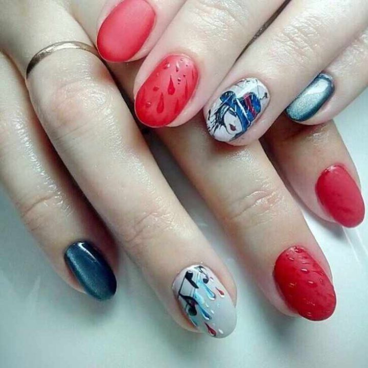 Дождевые капли на матовом красном лаке, цветные капли на матовом белом, рисунок девушка, на коротких овальных ногтях.