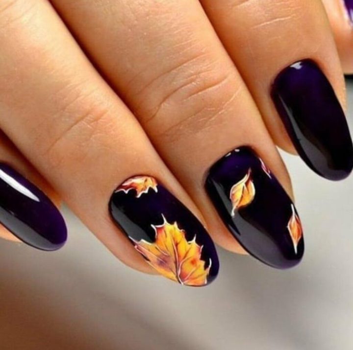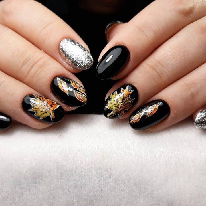 Черный маникюр, с листьями осенними.