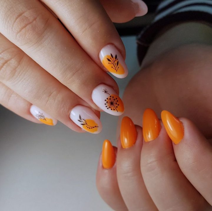Оранжевый маникюр, осенний веточки на белом фоне.