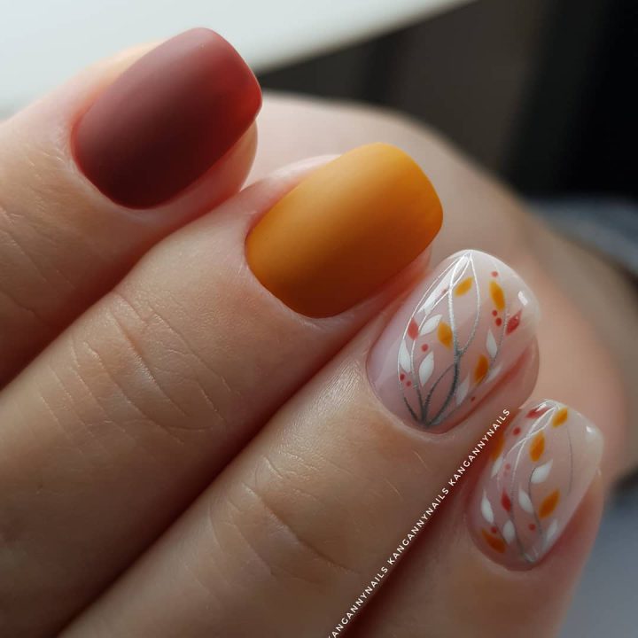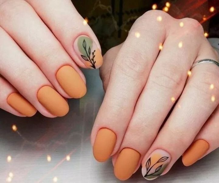 Типичный осенний маникюр – это матовый дизайн ногтей. Бархатный топ всегда выглядит уютно и элегантно.