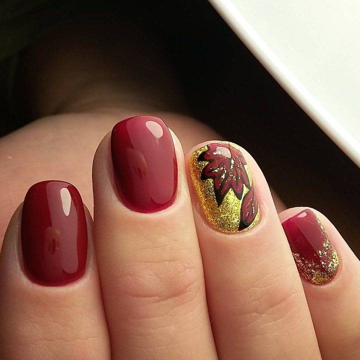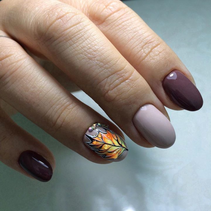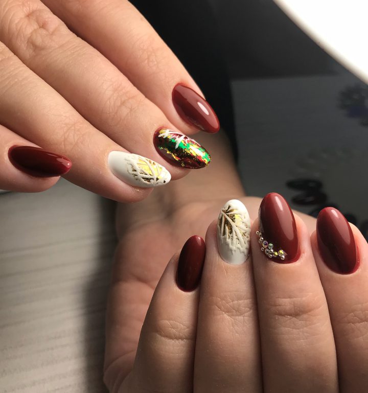 Темный маникюр бордовый на ногтях овальных, осенние листья.