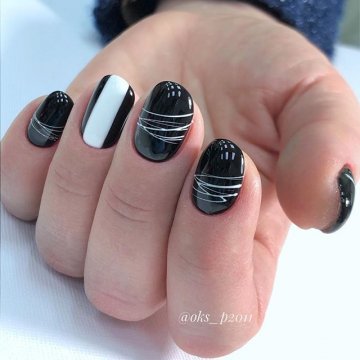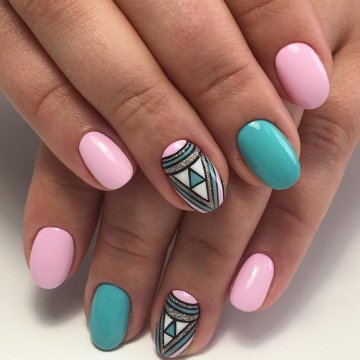 Дизайн с геометрическим рисунком твердо удерживает позицию модного маникюра на протяжении нескольких сезонов. Имея дело с овальной формой ногтей, мастера нейл-арта любят рисовать различные линии, геометрические фигуры и цветные блоки.
