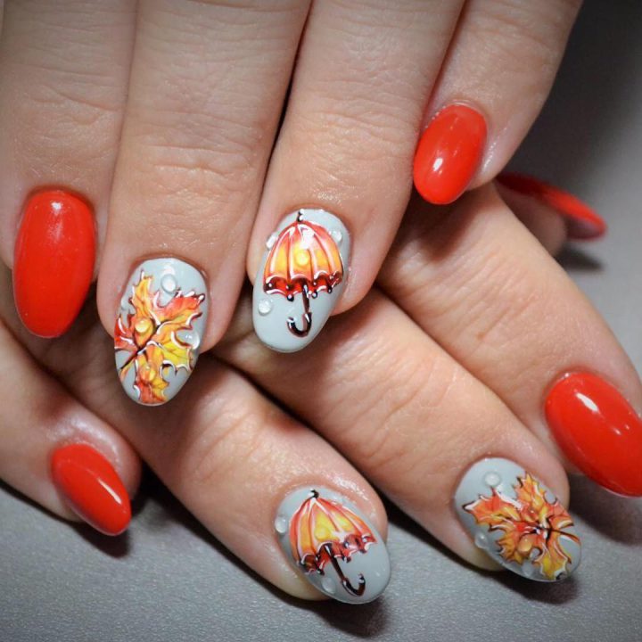 Овальные ногти осенние мотивы, рисунок зонтик и листик, красный лак.