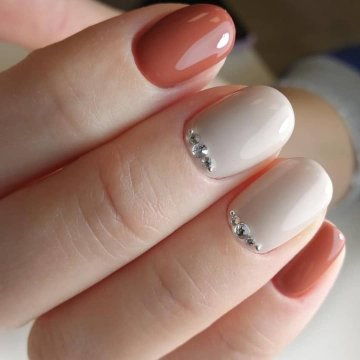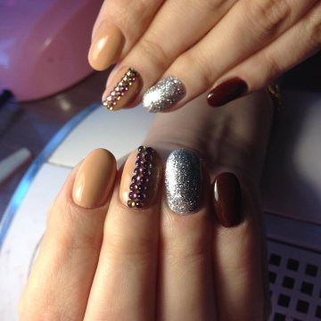 Холодные оттенки в маникюре, осенние краски, стразы, короткие ногти, овальная форма.