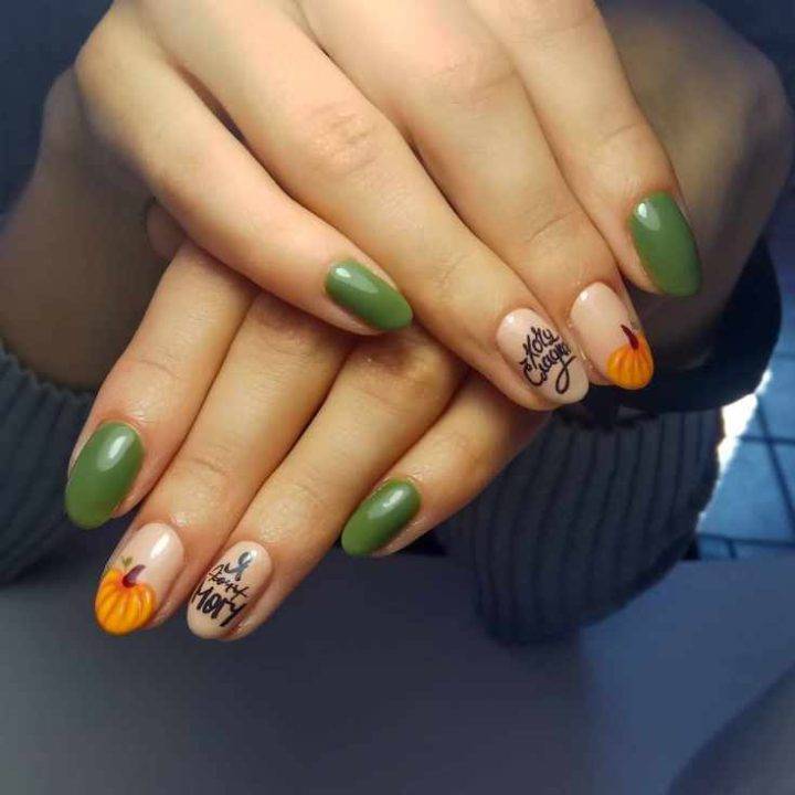 Маникюр осень, рисунок, надписи, короткие ногти овальной формы.