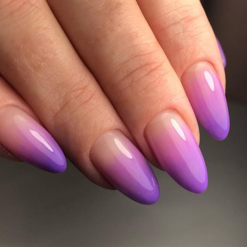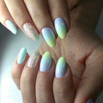 Изысканная техника омбре с плавным переходом безупречно смотрится на овальных ногтях. Она прекрасна сама по себе, но также может удачно сочетаться с рисунками, лепкой и стразами. Если у вас в планах зрительное удлинение ногтя, делайте растяжку цвета сверху вниз, а не слева направо.