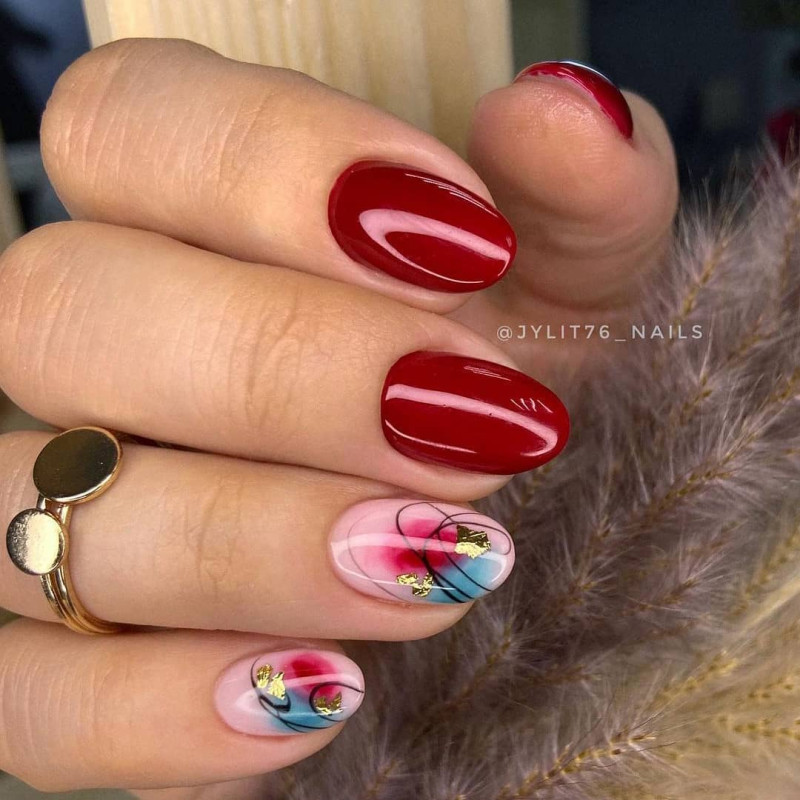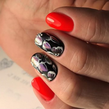 Кроме того, красиво и оригинально смотрится красное омбре в сочетании со стемпинг-дизайном, с наклейками, или с дизайном «разные руки».