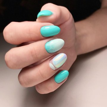 • Пальмовый дизайн – на самом деле, форма-овал является идеальной основой для нанесения на светлую основу базы зеленых ветвей пальмы с длинными тонкими листьями. На каждом ноготке – отдельная ветвь. Причем насыщенный зеленый цвет может быть нанесен не в опостылевшем однотоне, а выполнен при помощи техники градиентного окрашивания. Смотрится очень привлекательно.• Текстовый маникюр – является новинкой уже не первого сезона, но считается, что идеально смотрится именно на скругленной ногтевой пластине. При этом желательно применять не штамповый печатный текст со стикерами, а выводить тончайшей кистью слова каллиграфической красивой прописью. К примеру, стандартно черные буквы на молочном фоне смотрятся очень выразительно и акцентированно.