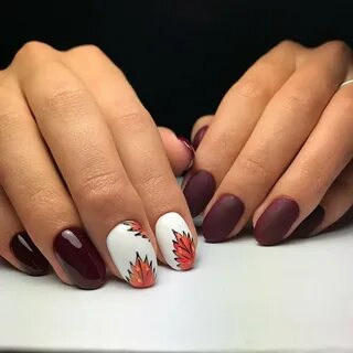 Бордовый гель лак на короткие овальные ногти, матовым лаком рисунок листья.