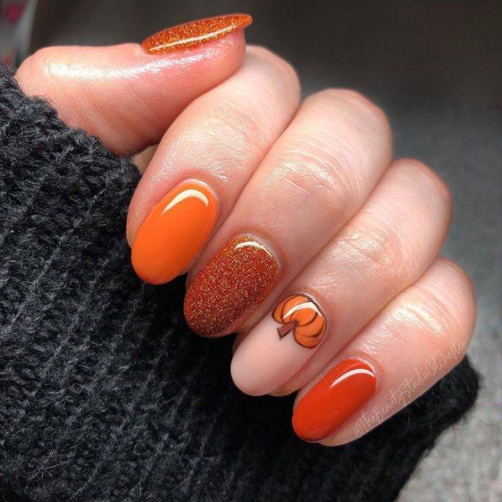 Аранжевый маникюр, рисунок тыква, осенний маникюр на овальных ногтях.