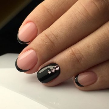 При желании вы можете внести нотку разнообразия в традиционный френч и дополнить его стразами, рисунками или втиркой. Результат таких экспериментов будет очень красивым. Еще одна актуальная идея – замена белой улыбки на полосу черного кружева – просто вау!