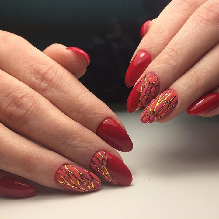 Красный маникюр, рисунок золотом на красном матовом лаке.