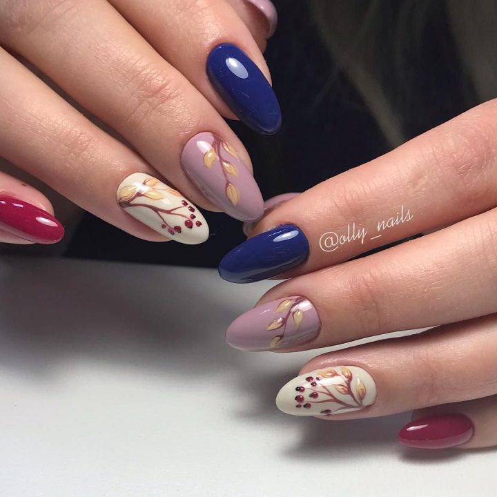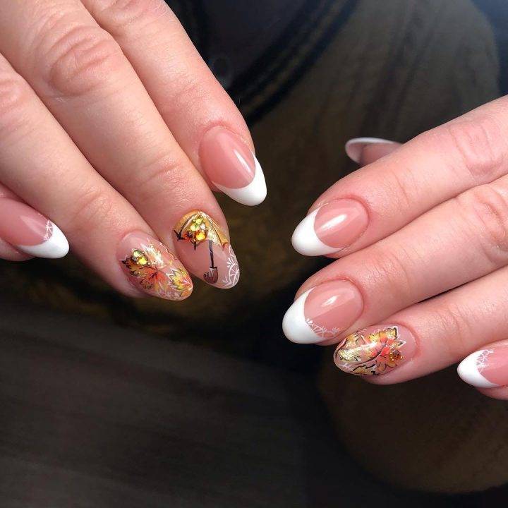 Маникюр осенний на ногтях овальной формы.