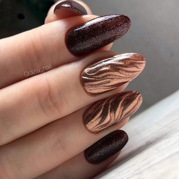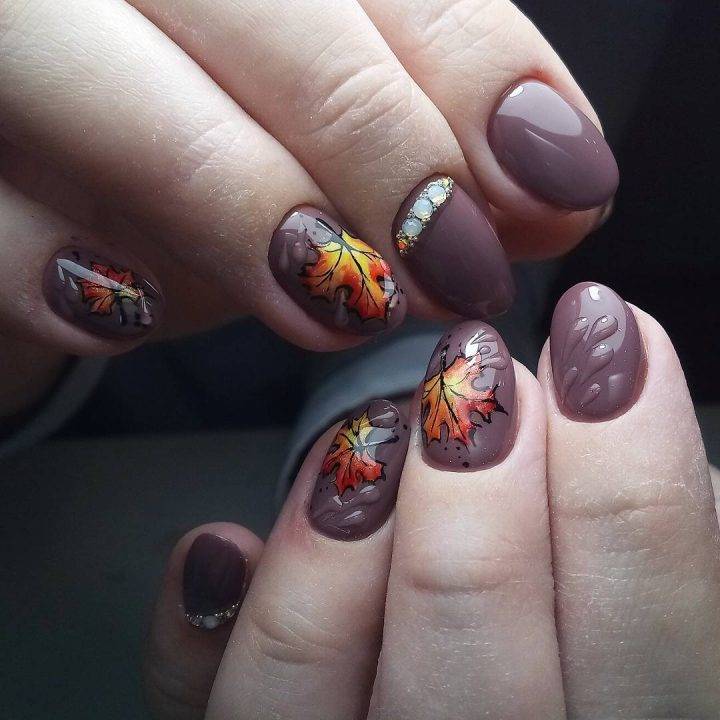 Шоколадный гель лак, капли акриловые, осенние листья, овальная форма ногтей.