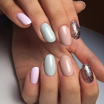 Например, нюдовое покрытие в сочетании с пастельным акцентом на нескольких ногтях и цветочным узором — воплощение романтики. Такой маникюр, несмотря на свою элегантность, никогда не останется незамеченным. Выбирайте его для свиданий, праздников и на каждый день. То же самое можно сказать и о нейтральном финише с вкраплениями сверкающего блеска. В этом случае они не будут слишком яркими, но в то же время выступят акцентом. Поэтому маникюр получится чуть более насыщенным.