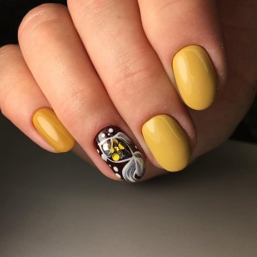 Желтый матовый маникюр осенние краски, на коротких овальных ногтях.