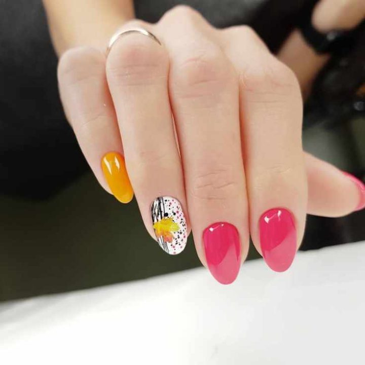 Яркий маникюр осенние краски, черные точки, осенний лист.