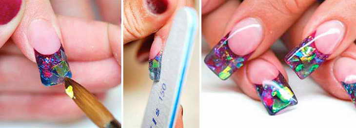 Помимо вышеописанных материалов для реализации стильного аквариумного маникюра используется фольга, блестки, бисер, мраморная крошка, стразы, разноцветные нити, кружева, сетки, мелкие картинки и фотографии. Как только вы определитесь с теми элементами, которые будут использоваться при реализации маникюра, приступайте к самой процедуре. Она базируется на следующих этапах: