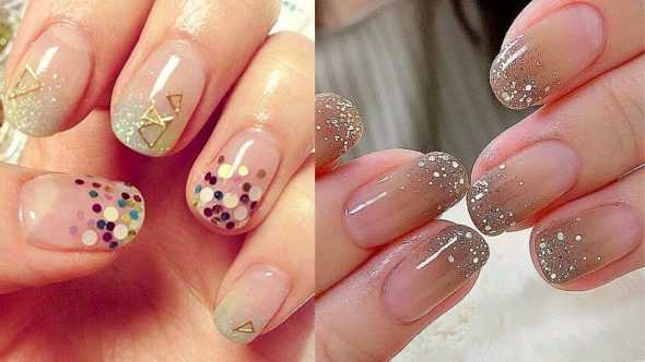 Техника градиент отличается гармоничными переходами одного цвета в другой. В качестве украшения используйте пайетки, блестки разных оттенков.