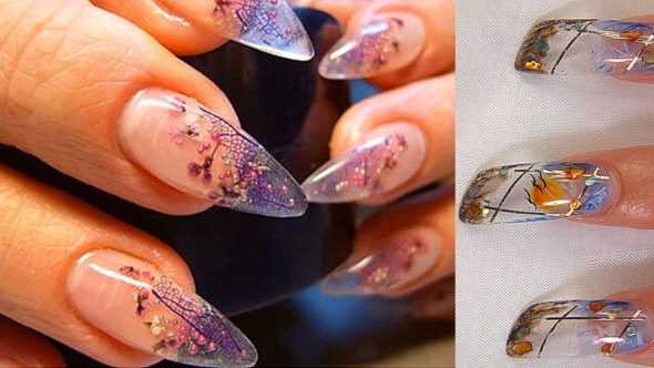 Подобный маникюр выгодно подчеркнет длинные ногти, однако он противопоказан коротким ноготкам. Ни с чем несравнимая естественность, хрупкость и нежность засушенных натуральных цветов придаст вам неповторимую очаровательность. Цветы необходимо тщательно выбирать по размеру, чтобы не исказить и не испортить узор. Дизайнеры рекомендуют использовать аквариумный дизайн в сочетании с французским или лунным маникюром.