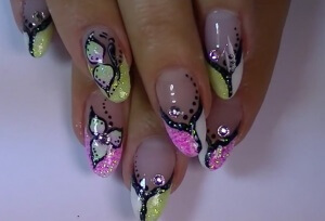 - Четвертый этап — один из самых ответственных. Он заключается в нанесении рисунков, блесток, фольги, страз и т.д. Преимуществом аквариумного дизайна маникюра является отсутствие ограничений в подборе декоративных элементов, использовать разрешается абсолютно все. Границы устанавливаются только умениями, фантазией мастерицы. При желании, дополнительно можно выполнить прорисовку кистью в виде узоров абстрактного типа, надписей.