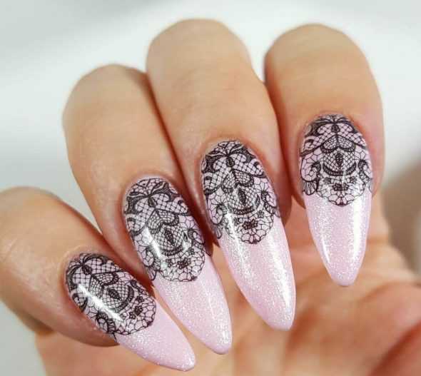 Красивое кружевное полотно на ноготках добавляют образу нежность, романтичность, утонченность, легкость. Кусочки кружева можно разместить на каждом ноготке или на одном-двух, добавить блесток, мини бисера. Желательно использовать тонкие кружевные фрагменты или готовые трафареты в стиле стемпинг.