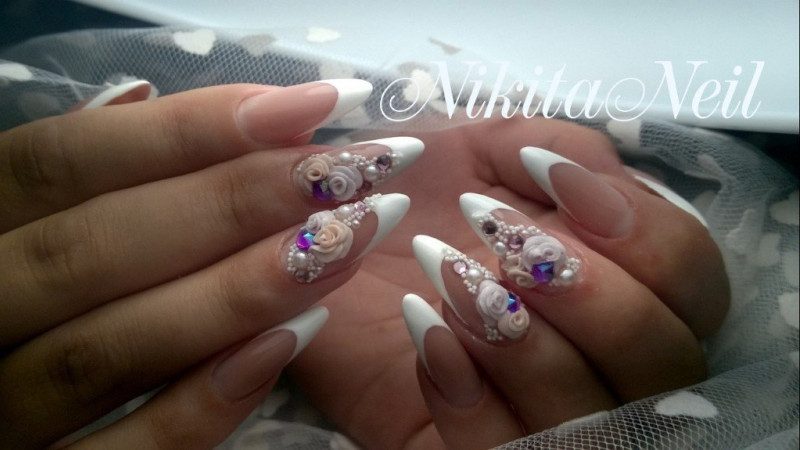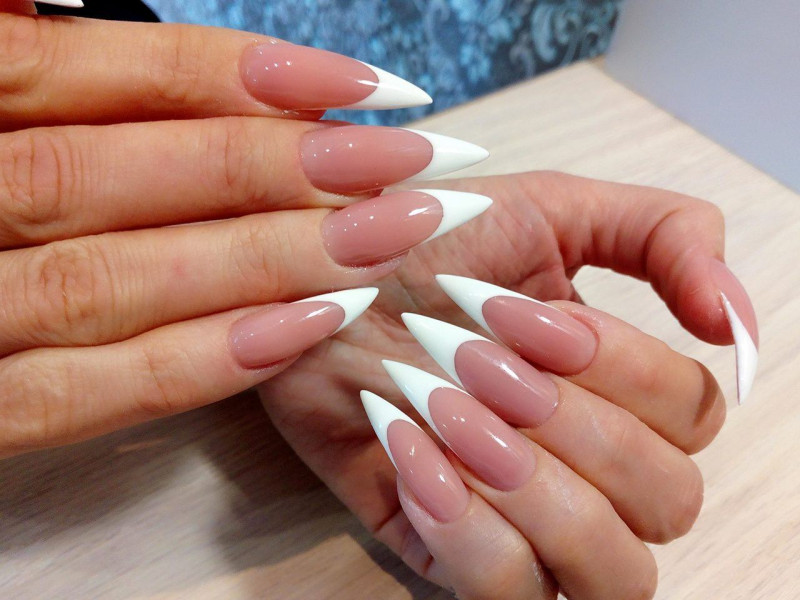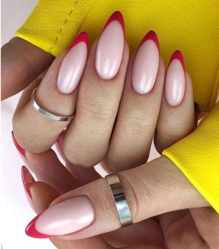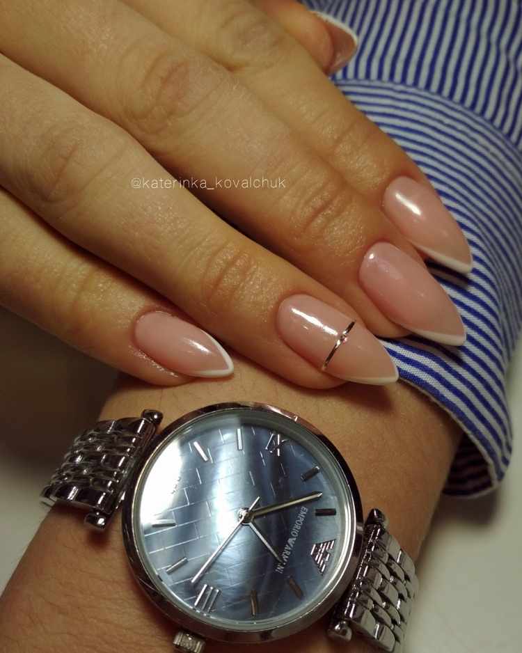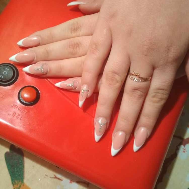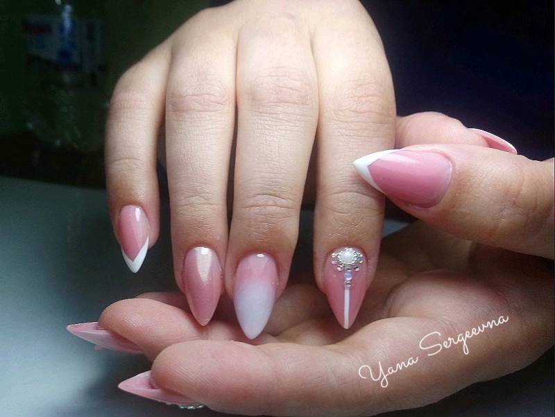 Острые ноготки в последнее время стали очень модными. Френч может стать идеальным дополнением и для них. Но помните, что с такой формой необходимо умеренно использовать цвета и яркие детали, чтобы маникюр не выглядел слишком уж вызывающе.