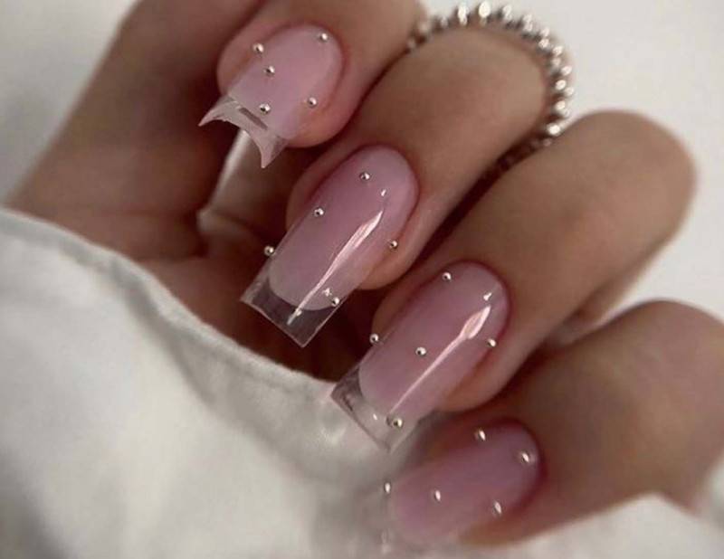 На ногтевые пластины наносят слой праймера, а затем – прозрачный или нежный розовый, телесный лак. Дают ему хорошо высохнуть.