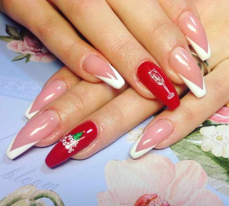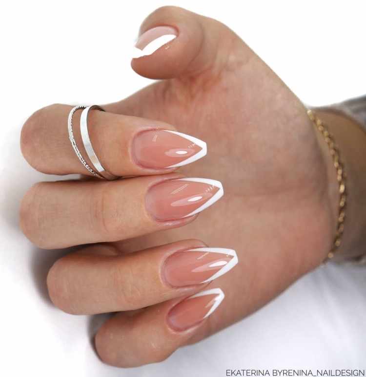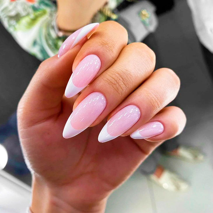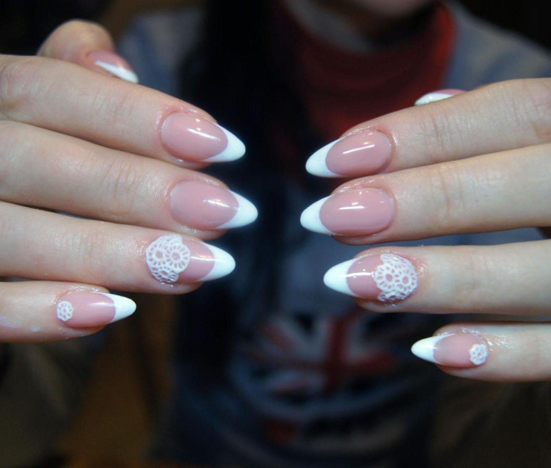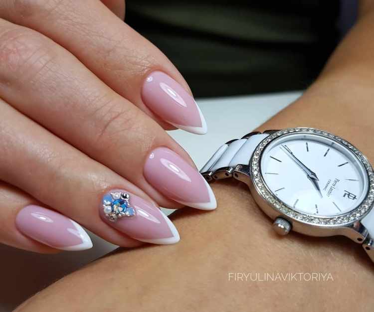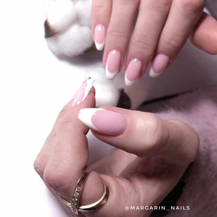 «Балерина» гармонично сочетается с классическим французским маникюром. Для такой формы ногтей подходит френч как с округлой, так и с треугольной линией «улыбки».