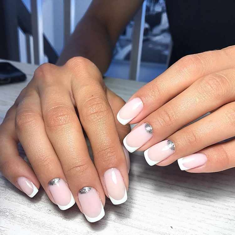 Многие представительницы прекрасного пола не представляют своего образа без блестящих деталей, поэтому дизайнеры не упустили такую возможность и усовершенствовали французский маникюр при помощи изысканного мерцания блестящих лаков, шиммера или глиттера