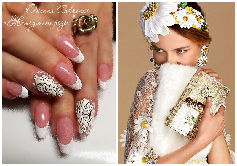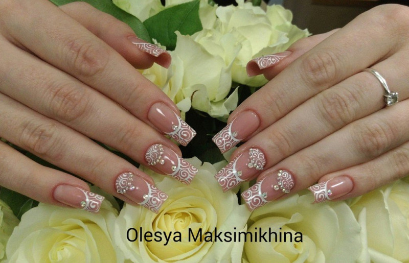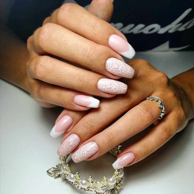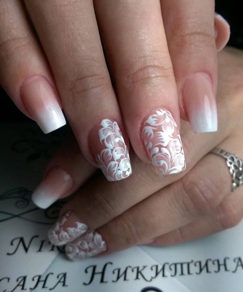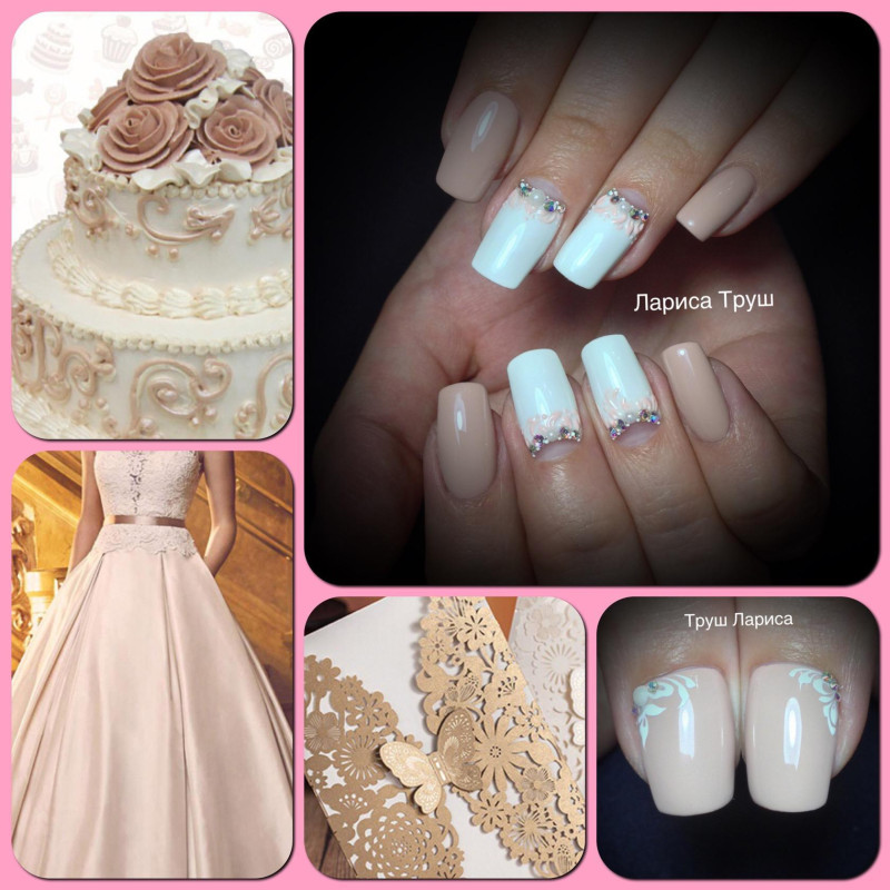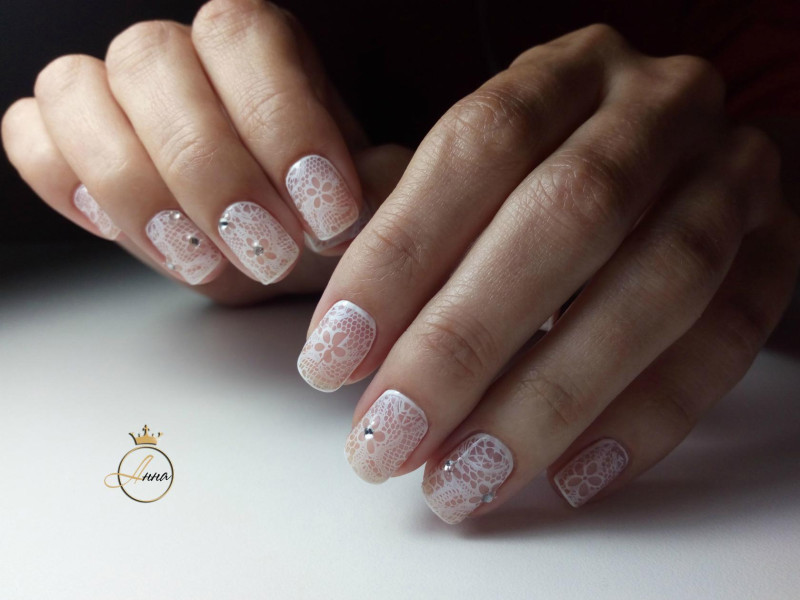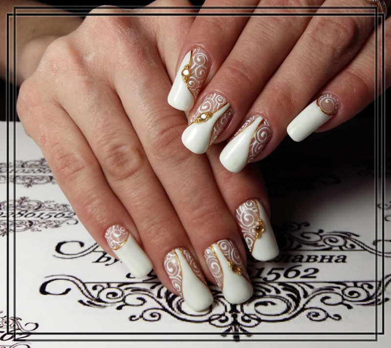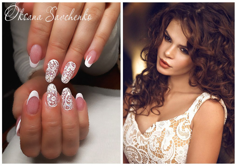 Красивый вариант ажурного, в том числе свадебного оформления с множеством узоров, вензелей. С помощью стемпинга можно получить кружева. В моде кремовый фон.