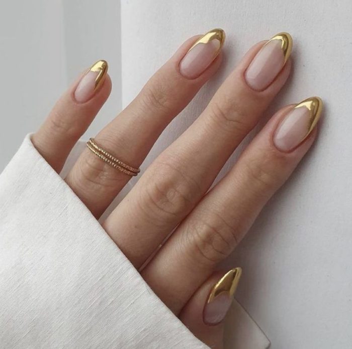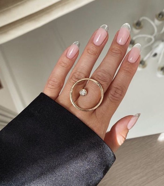 Элегантный вариант знакомого дизайна. Ноготки, кончики которых обработаны золотым или серебряным лаком, выглядят необычно и притягательно. Если использовать светлую базу, то такой вариант можно использовать и на каждый день. Он не будет смотреться слишком броско и вызывающе.