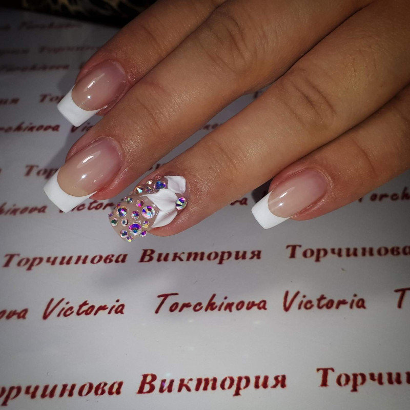 Несмотря на новые тенденции и технологии, классический французский маникюр звучит все так же актуально. Необязательно быть обладательницей длинных ногтей. На средней и короткой длине он выглядит очень эстетично. Такой вариант маникюра приемлем всегда и везде. Он способен выдержать требования даже самого строгого дресс-кода.