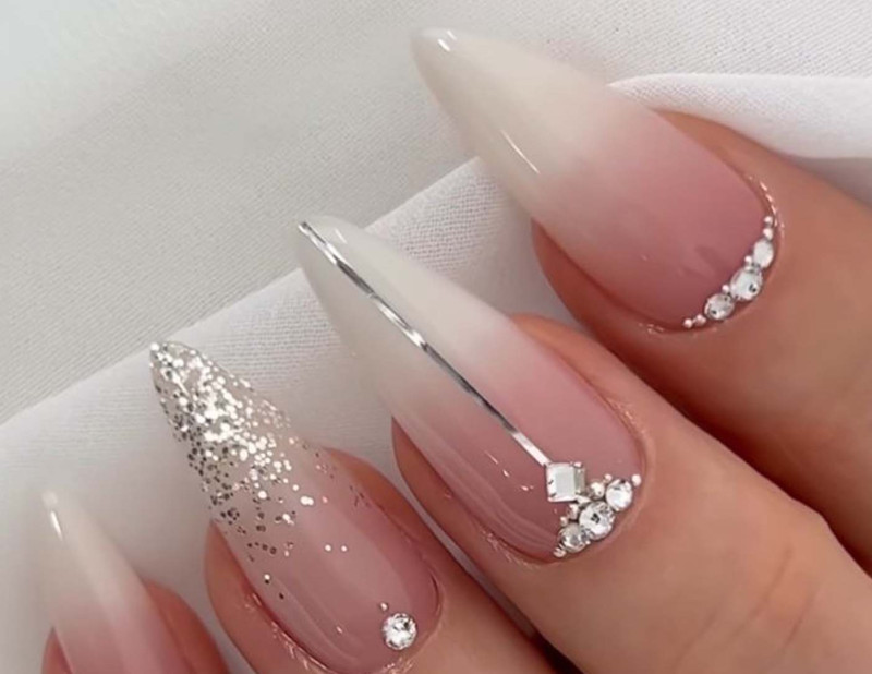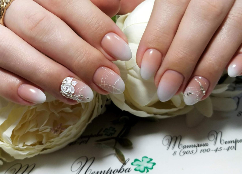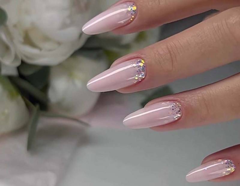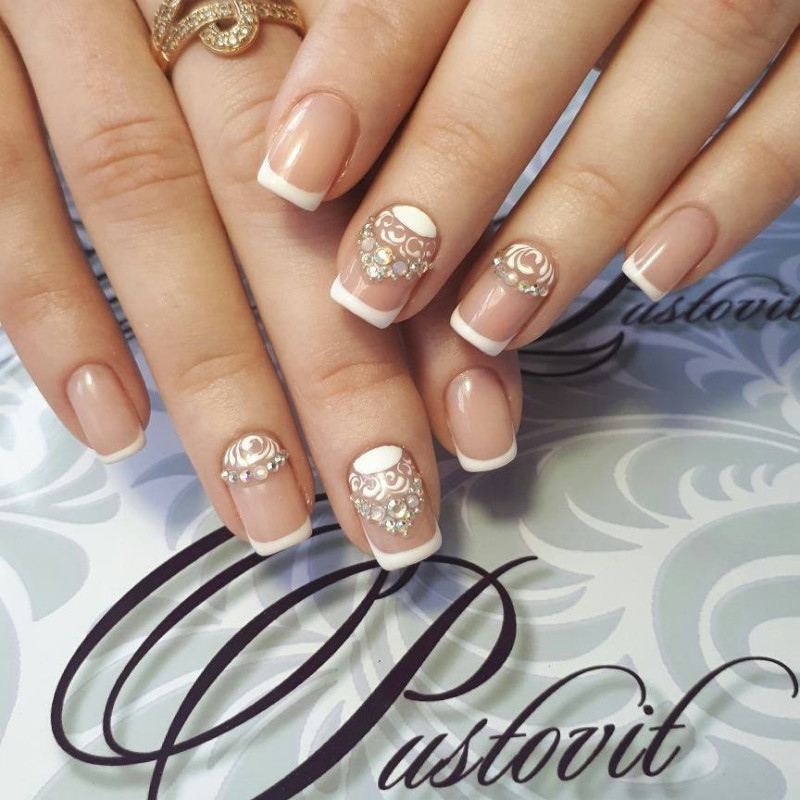 Свадебный маникюр со стразами всегда выглядит празднично и нарядно. Для дизайна можно выбрать россыпь страз или жемчуга на ногтях. Также этот декор можно расположить или в зону кутикулы, или в зону френча. Конечно же свадьба — это блеск, поэтому можно воспользоваться моментом и выложить блёстки в зоне кутикулы, перекрыв всё молочным гелем. Это, пожалуй, самый трендовый дизайн, который можно применить и в маникюр на свадьбу 2023.
