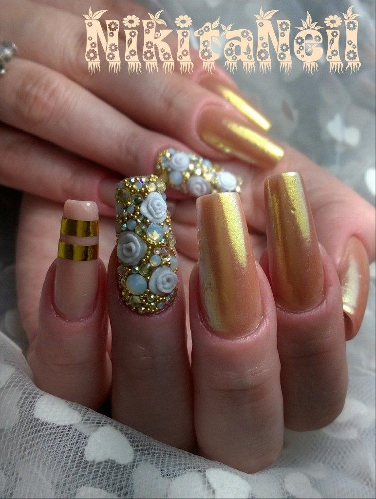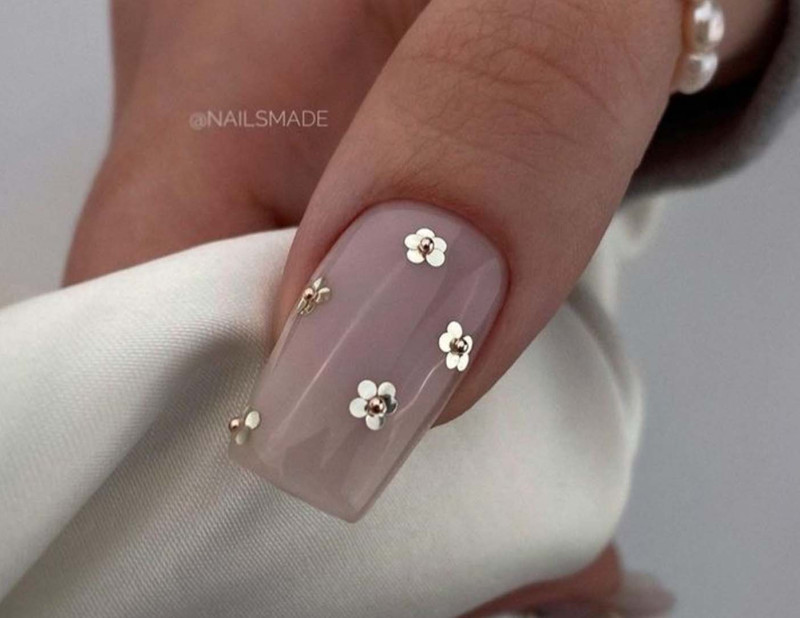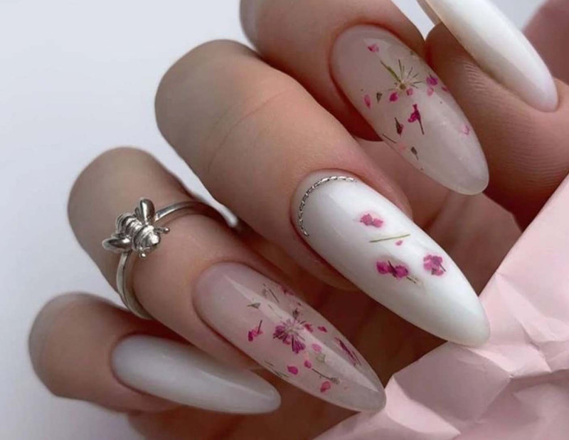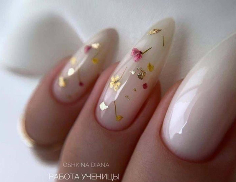 Кусочки потали, выложенные сверху покрытия или наоборот, положенные внутри, как никогда выигрышно смотрятся на свадебных ногтях. Поталь бывает в разных оттенках: серебро, золото, медь. Поэтому можно подобрать под любую стилистику свадьбы. Если свадьба будет проходить в цветочных композициях, то можно невесте предложить использовать для декора свадебного маникюра сухоцветы. Они бывают самых разнообразных цветов и прекрасно сочетаются с кусочкам потали.