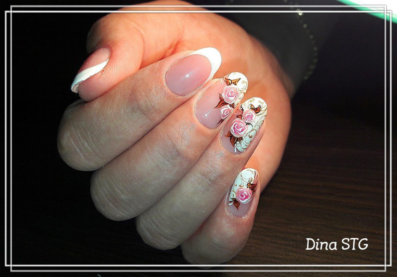 Техника омбре настолько универсальна, что может использоваться как самостоятельно, так и в сочетании с другими способами украшения ноготков. Френч и омбре – лучшее сочетание, которое можно себе представить. На пике популярности дизайны где:
