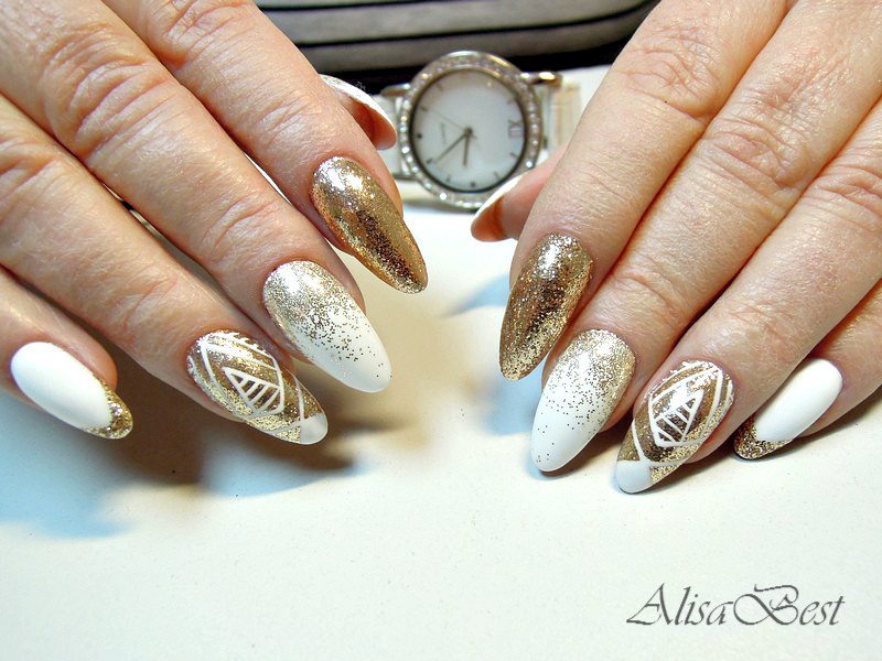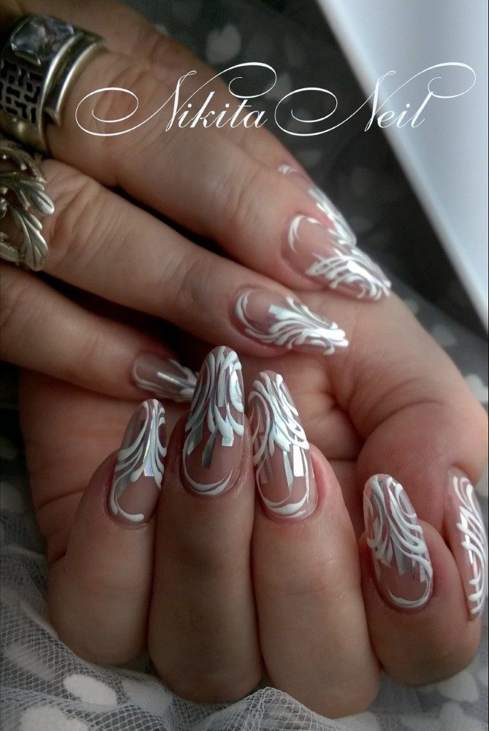 На острых ноготках красиво смотрятся геометрические рисунки. Вы можете оставить большую часть ногтей прозрачной с белой улыбкой, а вот на паре ноготков нарисовать стильные абстрактные узоры.