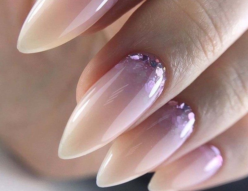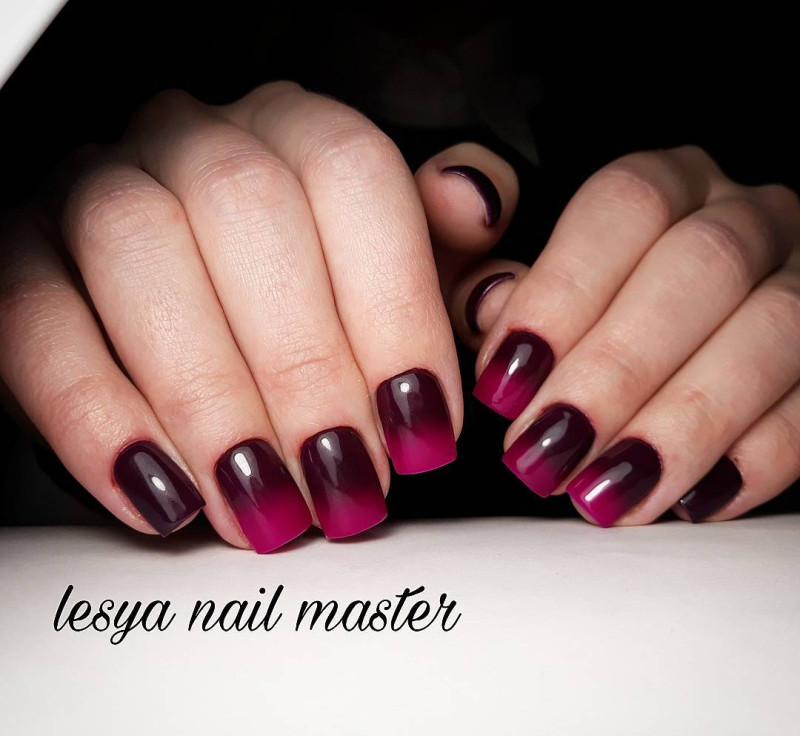 Модная тенденция, позволяющая сочетать очень много текстур. градиент переходит друг в друга, например, розовый и сиреневый, бордовый и нюдовый. В тренде акцентирование ярким гель – лаком. Популярен горизонтальный омбре.